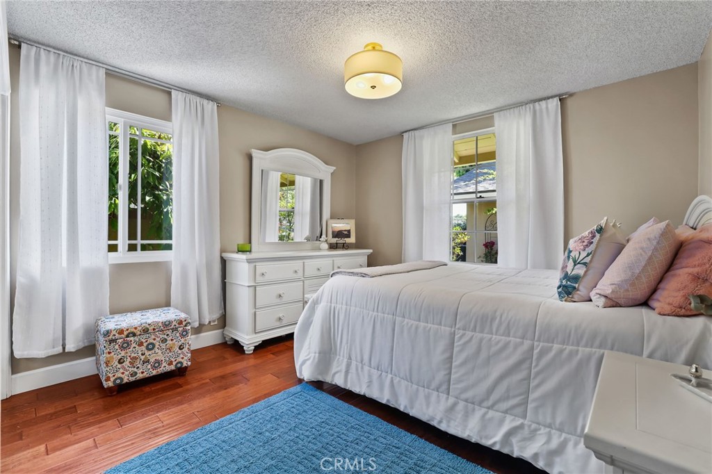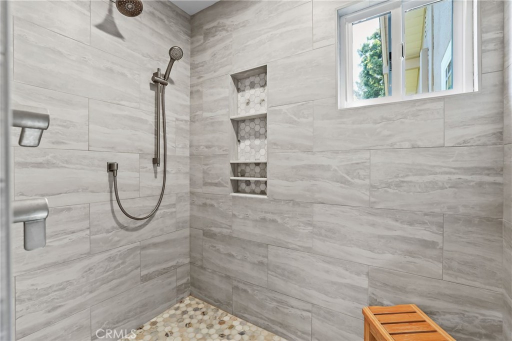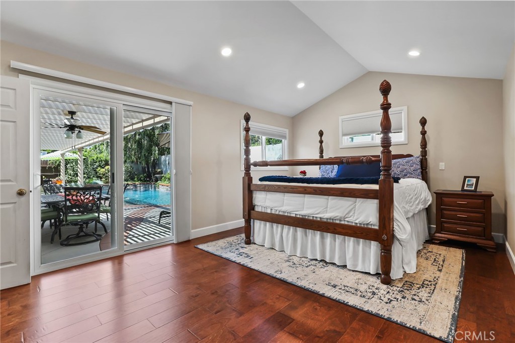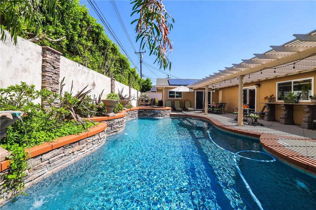 Nestled in the center of Rossmoor, this beautifully updated five-bedroom, three-bathroom home blends timeless style with updated comfort. From the curb, you'll appreciate the meticulous exterior complete with a custom garage door on the detached garage and a custom side gate, enhancing both privacy and curb appeal. Step inside to discover an inviting living room with a cozy stone fireplace perfect for entertaining family and friends. It seamlessly flows to the dining room thoughtfully located next to the beautifully designed kitchen. Remodeled in 2021, the kitchen is a standout with granite countertops, shaker-style custom cabinetry, subway tile backsplash, and premium LG appliances. A custom buffet and bar area brings extra style and function to your hosting space. The guest rooms are generously appointed with upgraded windows, recessed lighting and mirrored closets. The primary suite, remodeled in 2022, is a true sanctuary, offering vaulted ceilings, recessed lighting, and direct access to the backyard through a sliding glass door. The luxurious ensuite bath boasts quartz countertops, double sinks, custom shaker cabinets, a soaking tub, stone tile shower, and a private toilet closet. Step into your own backyard oasis complete with a sparkling pool with dual decorative fountains, gas fireplace, built-in BBQ with beverage fridge, outdoor sound system, and landscape lighting--an entertainer's dream and a relaxing escape all in one.